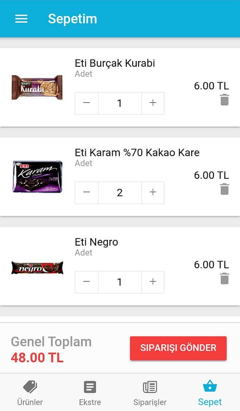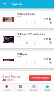 Müşteriniz ürünleri sipariş vermeden önce ilk olarak sepetine ekler daha sonra sepette istediği üründen istediği miktar kadar belirledikten sonra siparişi gönder butonuna tıkladıktan yaklaşık 5 dk. içerisinde hem ana yazılımınıza hemde sahatek mobil yazılımına sipariş olarak bildirim gelir.